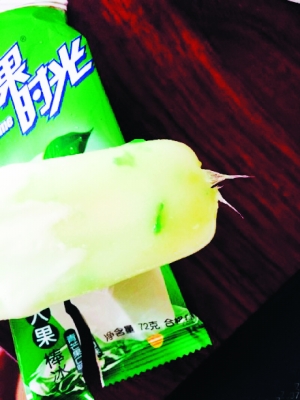 許先生說:“那天下午兩點(diǎn)多,我去超市買了6個(gè)宏寶萊的鮮果時(shí)光雪糕,回家后我和父母每人吃了一個(gè),而我的那個(gè)雪糕沒吃幾口就咬到一個(gè)硬物。我以為是椰果,便用力咬了一下,卻發(fā)現(xiàn)根本咬不動(dòng),低頭一看,發(fā)現(xiàn)雪糕里露出一塊塑料布。因?yàn)槲矣昧σ?,這塊塑料布已被拽出一部分,還有一部分凍在里面。”記者看到許先生拿出的雪糕上半部分露出了兩塊塑料布。