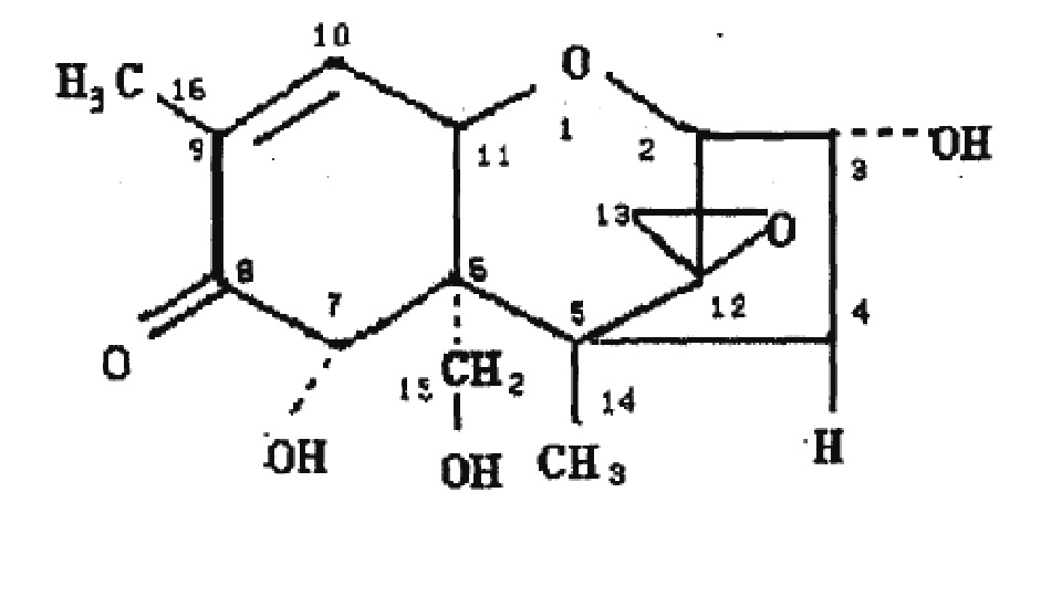 嘔吐毒素是一種單端孢霉烯族毒素,主要由粉紅鐮刀菌和禾谷鐮刀菌產(chǎn)生。其化學名為3α,7α,15-三羥基-12,13-環(huán)氧單端孢霉-9-烯-8-酮,化學式為C15H20O6,純品是一種無色針狀結晶,可在乙酸乙酯和甲醇中長期保存。低劑量的嘔吐毒素,主要引起動物食欲下降、體重減輕、代謝紊亂等癥狀,大劑量可導致動物嘔吐。嘔吐毒素對消化系統(tǒng)、血液系統(tǒng)、中樞系統(tǒng)以及鈣磷代謝均產(chǎn)生影響,嘔吐毒素具有慢性和亞慢性毒性、急性毒性、免疫毒性等多種毒性作用。