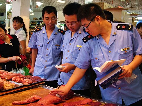 隨后,記者向食藥監(jiān)部門反映此事,當(dāng)日14時許,??谑协偵絽^(qū)中山食品藥品監(jiān)督管理所執(zhí)法人員趕到現(xiàn)場。執(zhí)法人員用手摸了摸攤位上的牛肉,并沒有立即做出判斷?!笆遣皇亲⑺H?,通??梢杂檬置?,看看黏不黏手,但這不能作為執(zhí)法的依據(jù)?!眻?zhí)法人員隨即聯(lián)系了瓊山區(qū)食品藥品監(jiān)督管理局有關(guān)負(fù)責(zé)人,詢問是否可以用食品快檢車檢測注水肉,得到的答復(fù)是“暫時不可以”。該執(zhí)法人員稱,目前??谑乘幈O(jiān)部門正計(jì)劃引進(jìn)一種可以快速檢測注水肉的儀器CSY-R肉類水分測定儀,待儀器配備到位后,他們將對培龍市場的所有鮮肉攤進(jìn)行檢測,排除隱患。