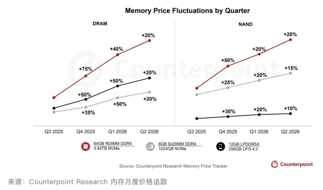 作為內(nèi)存核心組件的存儲(chǔ)芯片,價(jià)格同步開(kāi)啟飆升模式。據(jù)市場(chǎng)研究機(jī)構(gòu)Counterpoint Research發(fā)布最新行業(yè)報(bào)告指出,2025年四季度內(nèi)存價(jià)格將飆升40%-50%,預(yù)計(jì)2026年一季度還將再漲40%–50%,二季度預(yù)計(jì)再上漲約20%,整體漲勢(shì)未改。