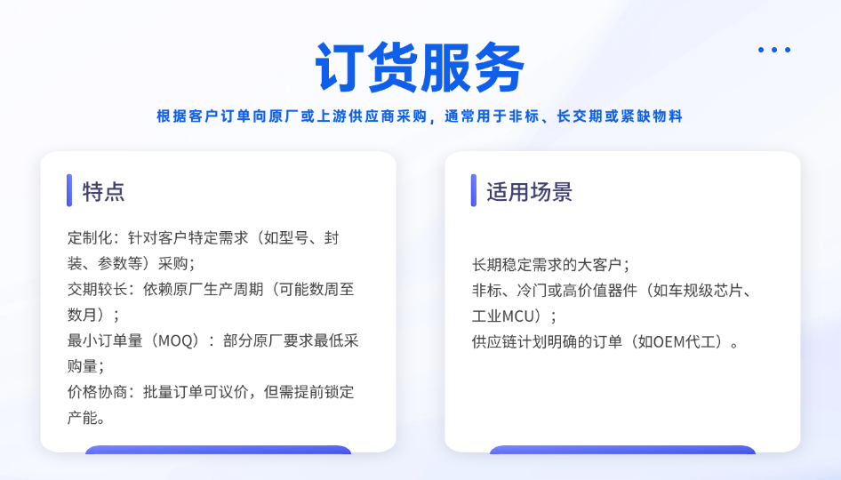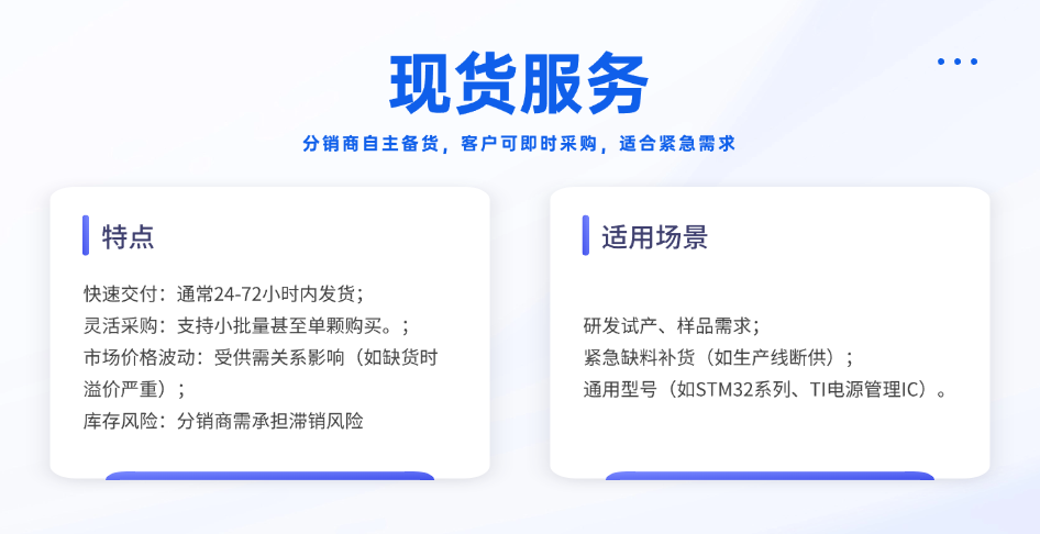 現(xiàn)貨服務(wù)是半導(dǎo)體分銷商提升競(jìng)爭(zhēng)力的重要手段。在市場(chǎng)需求瞬息萬變的當(dāng)下,擁有充足的現(xiàn)貨庫(kù)存能夠快速響應(yīng)客戶的緊急需求,為客戶節(jié)省時(shí)間成本,提升客戶滿意度。