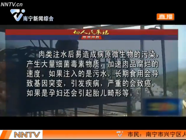 南寧市食品藥品監(jiān)督管理局局長(zhǎng)黃明瑞回應(yīng):對(duì)于注水肉的問(wèn)題,我們從改革以來(lái)就一直堅(jiān)持打擊,特別是今年夏季針對(duì)肉類(lèi)食品進(jìn)行了大規(guī)模的整治行動(dòng),發(fā)現(xiàn)問(wèn)題后馬上進(jìn)行懲處。首先我們要從源頭上杜絕注水肉,第二,肉類(lèi)在進(jìn)入市場(chǎng)要進(jìn)行檢驗(yàn)檢測(cè),合格以后才能上市銷(xiāo)售,市場(chǎng)開(kāi)放方要建立查驗(yàn)查證制度,作為監(jiān)管部門(mén)要加大巡查力度,發(fā)現(xiàn)有違法添加的要立案進(jìn)行查處。