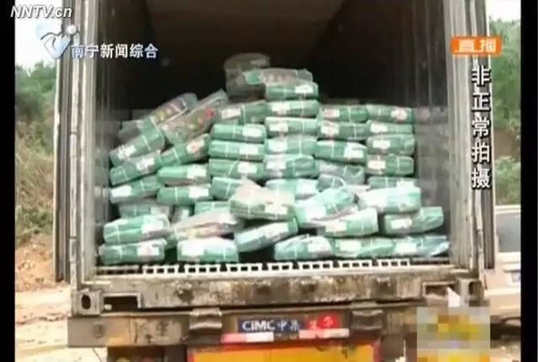 5月7日上午11點(diǎn)30分,劉圩鎮(zhèn)覃坡一處廢棄的木片廠區(qū)內(nèi),兩輛玉林牌照的紅色集裝箱貨車(chē)停放在空地,幾個(gè)貨車(chē)司機(jī)邊觀望邊等待。兩小時(shí)后,一輛藍(lán)色大貨車(chē)開(kāi)進(jìn)廢棄廠區(qū),并與其中一輛集裝箱貨車(chē)尾對(duì)尾交接。