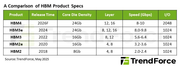 TrendForce指出,與前幾代產(chǎn)品相比,HBM4的I/O數(shù)量翻了一番,從1024個(gè)增加到2048個(gè),同時(shí)保持了8.0 Gbps以上的數(shù)據(jù)傳輸速率。這意味著,由于通道數(shù)增加,HBM4可以在相同速度下提供兩倍的數(shù)據(jù)吞吐量。